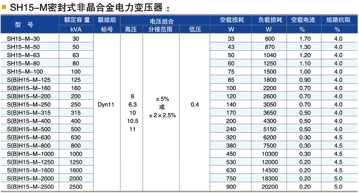 SH15-M-30~2500/6~10系產品,空載損耗在GB/T6541標準值基礎上下降百分之70。執行標準GB/T25446-2010《油浸式非晶合金鐵心配電變壓器技術參數》。